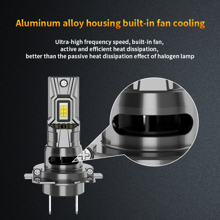 Aktives Kühlsystem für verlängerte Lebensdauer: Ausgestattet mit einem integrierten, ultraschnellen Lüfter im Aluminiumgehäuse sorgt dieses System für aktive und effiziente Wärmeableitung. Diese überlegene Kühlung übertrifft die passive Wärmeverwaltung von Halogenlampen, schützt die LED-Chips und verlängert die Gesamtlebensdauer des Produkts.