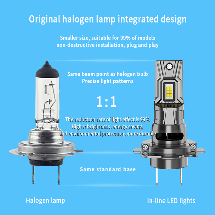 1:1 Halogen-Integriertes Design für einfache Installation: Entwickelt, um perfekt die Größe und den Standard-Sockel Ihrer originalen Halogenlampe (1:1 Verhältnis) zu entsprechen, gewährleistet es eine zerstörungsfreie Plug-and-Play-Installation, die für etwa 99 % der Fahrzeugmodelle geeignet ist. Erreichen Sie präzise Lichtmuster und einen nahtlosen Austausch in wenigen Minuten.