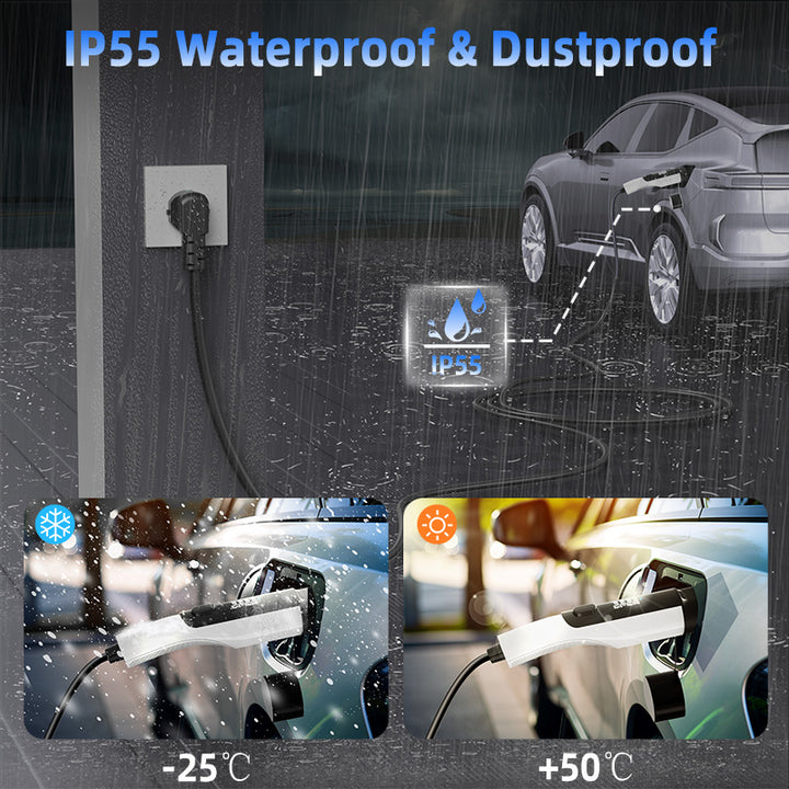 - IP55 odolnosť proti vode a prachu: Vyrobené s odolným krytom, naša **mobilná nabíjačka pre elektromobily s certifikáciou IP55** zvláda rôzne európske poveternostné podmienky. Funguje bez problémov od -25℃ do 50℃, je spoľahlivá v každom počasí.