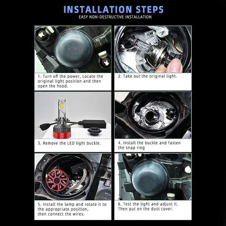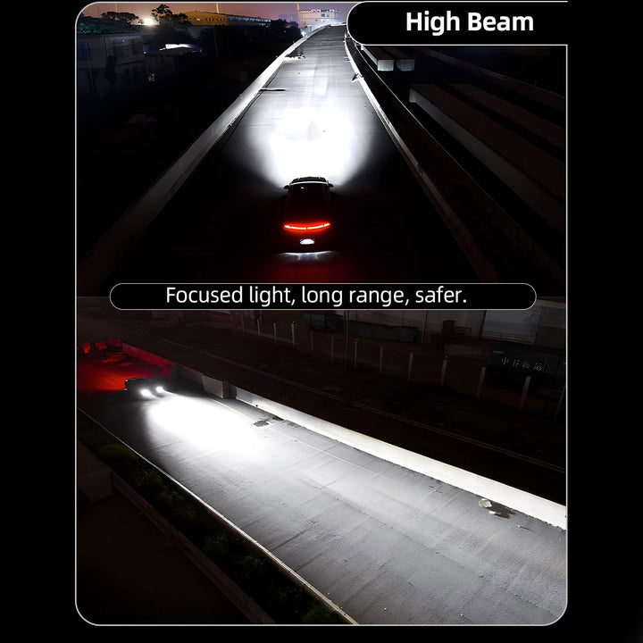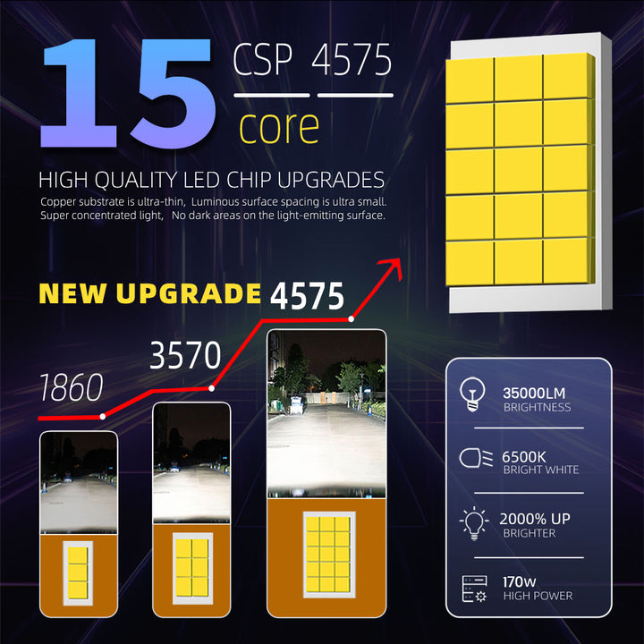 EXTRÉMNA SVETLOSŤ S 15-JADROVÝMI CSP 4575 ČIPMI: Navrhnuté s najnovšou technológiou LED čipov 15-jadrových CSP 4575, táto sada svetlometov poskytuje obrovských 35 000 lúmenov a 170W výkonu na sadu. S farebnou teplotou 6500K studenej bielej sú tieto žiarovky o 2000 % jasnejšie ako štandardné halogény, čo zabezpečuje širší a vzdialenejší osvetľovací rozsah na elimináciu tmavých oblastí na ceste.