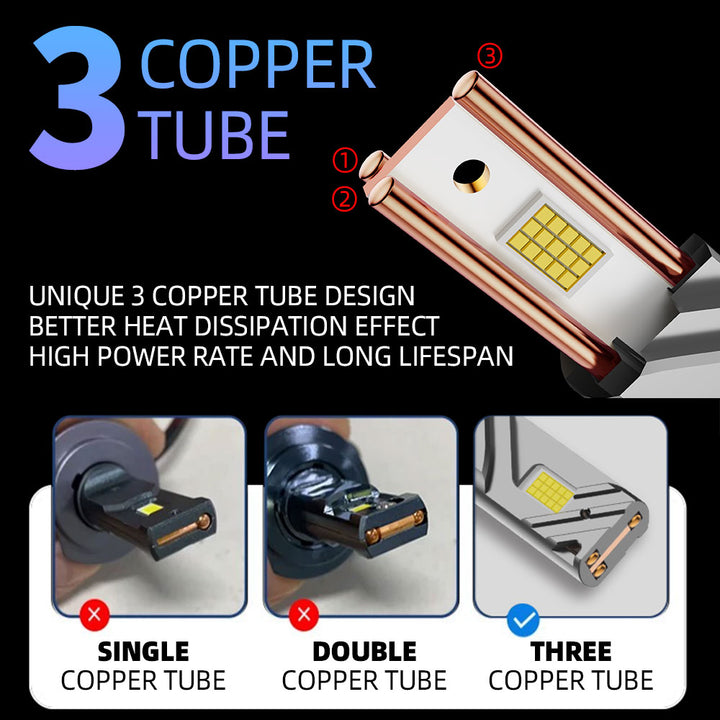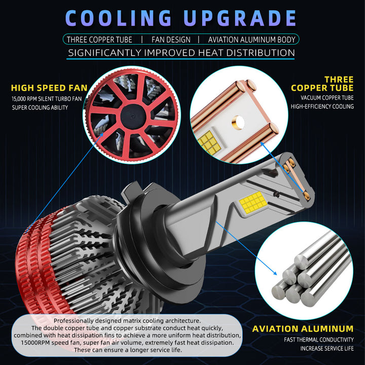 REVOLUČNÝ CHLADIACI SYSTÉM S 3 MEĎNÝMI TRUBICAMI: Na rozdiel od štandardných žiaroviek, ktoré používajú jednu alebo dve tepelné trubice, tento model má prémiový unikátny dizajn s 3 meďnými trubicami pre vynikajúcu tepelnú vodivosť. V kombinácii s telom z leteckého hliníka a tichým turbo ventilátorom s otáčkami 15 000 RPM, matričná chladiaca architektúra účinne zabraňuje prehriatiu, čím zabezpečuje stabilný vysoký výkon a výrazne dlhšiu životnosť.